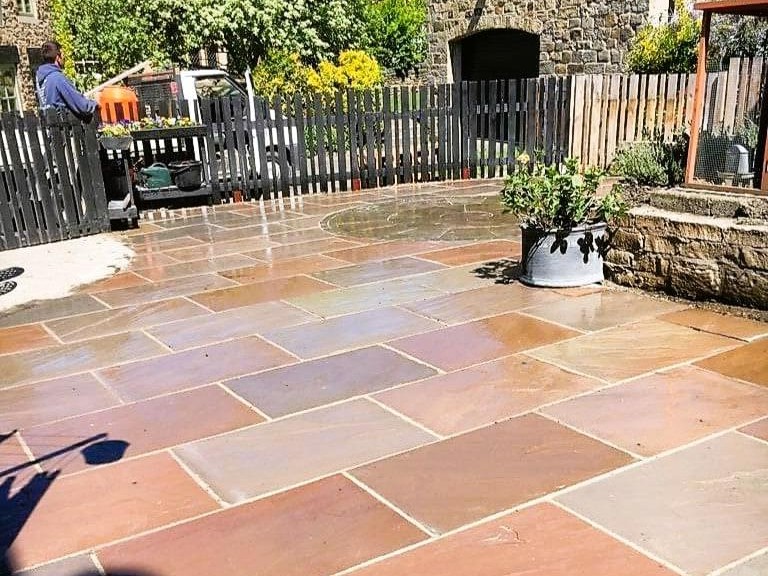 Autumn brown sandstone paving is a versatile slab that gives the choice of garden paving and gives a warm impression by the Autumn brown natural blend of brownish shades. These natural Sandstone variations between each slab make this style of Indian sandstone popular throughout Britain, These slabs are available as individual paving slabs, allowing you to design your own patio patterns and layouts. With the hand-cut edge, riven surface, and warm color tones, this product is attractive in anywhere but lends itself well to a rural scene.
